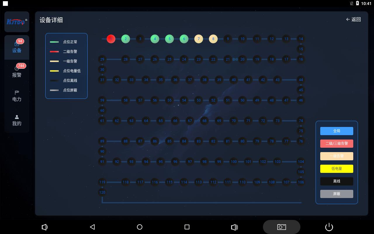設(shè)備詳情頁實(shí)時(shí)顯示皮帶上保護(hù)裝置當(dāng)前狀態(tài)鏈路圖,分為6種樣色顯示,分別代表保護(hù)裝置正常,保護(hù)裝置保護(hù)裝置二級(jí)告警,保護(hù)裝置一級(jí)告警,保護(hù)裝置電量低,保護(hù)裝置離線,保護(hù)裝置屏蔽六種狀態(tài)。