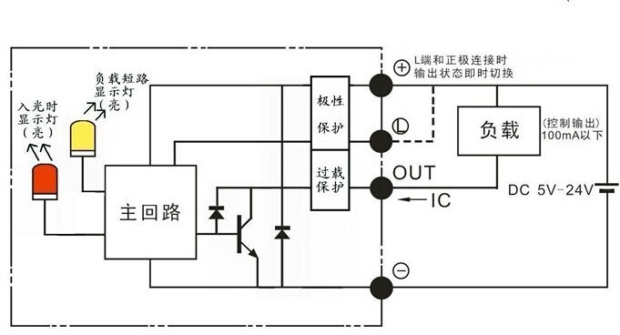 ● “L”引線與“+”引線相接時(shí),輸出狀態(tài)即時(shí)轉(zhuǎn)換如:設(shè)傳感器現(xiàn)態(tài)為受光時(shí)指示燈亮、“out”沒有輸出電流,相接后指示燈仍亮、但“out”有輸出電流。其它各引腳接線錯(cuò)誤時(shí),傳感器不工作,但傳感器本身不會損壞;