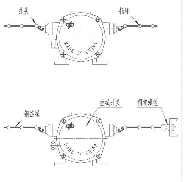 當膠帶運輸現(xiàn)場發(fā)生緊急事故時,拉動系在吊耳上的鋼絲繩,是機內(nèi)的滑塊與開關(guān)作用,發(fā)出停機信號。 松開鋼絲繩后開關(guān)自動復(fù)位。